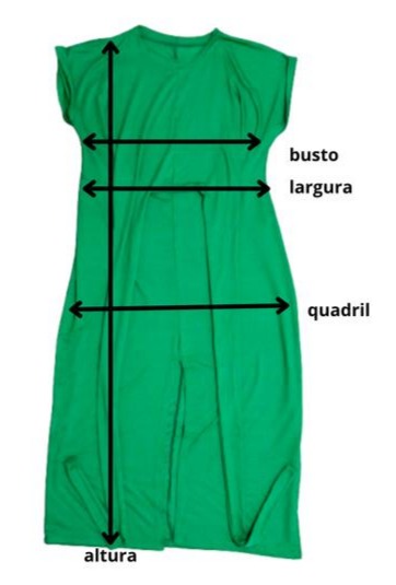 2. Coloque o vestido sobre uma mesa e meça o busto, a largura, o quadril e a altura (conforme a imagem abaixo) e baseie-se nestas medidas: